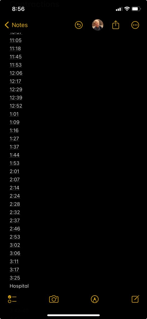 Contractions were about every hour, but then quickly ramped to every 20 minutes around 9pm, roughly 30 seconds each. They weren’t the normal Braxton Hicks ones I had been feeling for the past few weeks. We threw on Planet of the Apes for some distraction. I called the hospital. I probably sounded too cheery on the phone, because they suggested to drink water and that I was probably just dehydrated. I told Philip to go to bed (he was probably too anxious to sleep), and moved to the main floor. I turned on The Office, got my exercise ball, and worked through contractions for 6 hours, logging each time in a notes app shared with Philip. There was something peaceful about working through these on my own. I remember feeling comfort. Pain without anxiety. I could feel prayers answered. Peace.